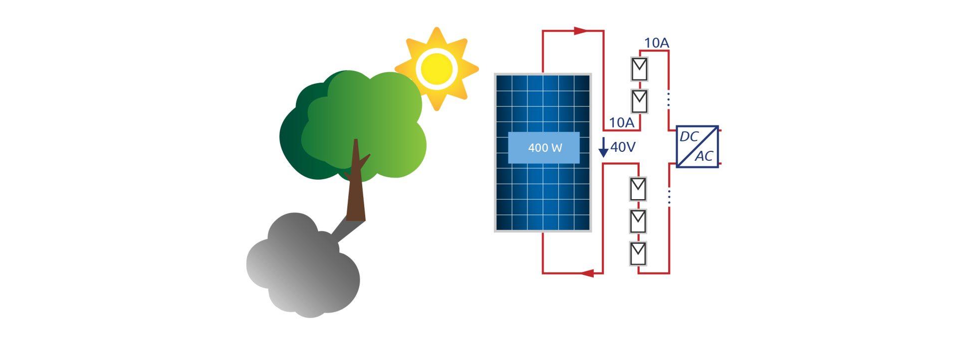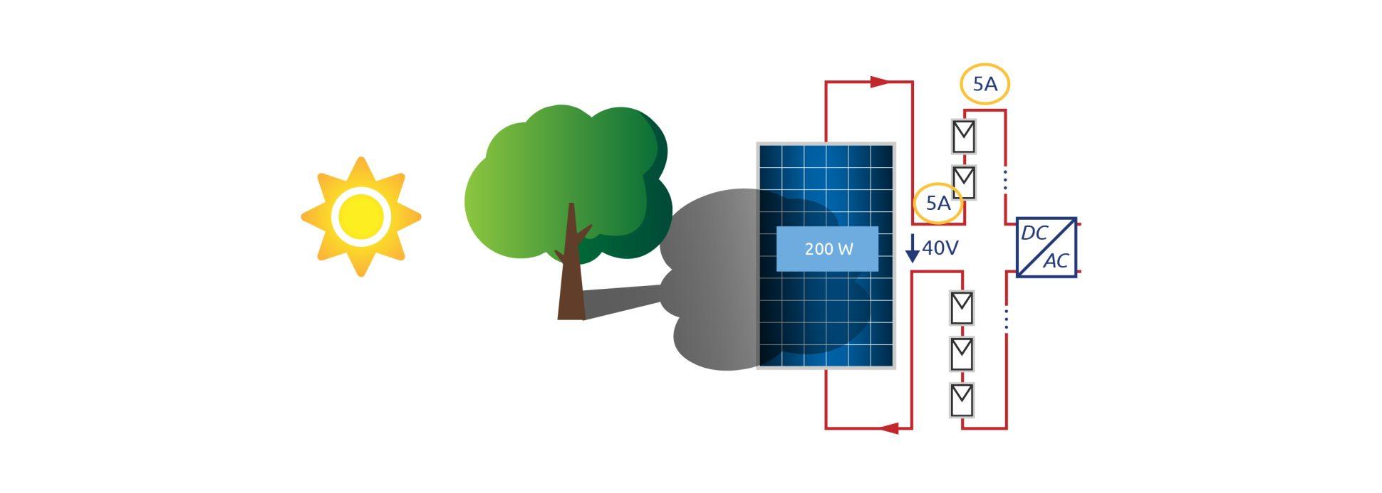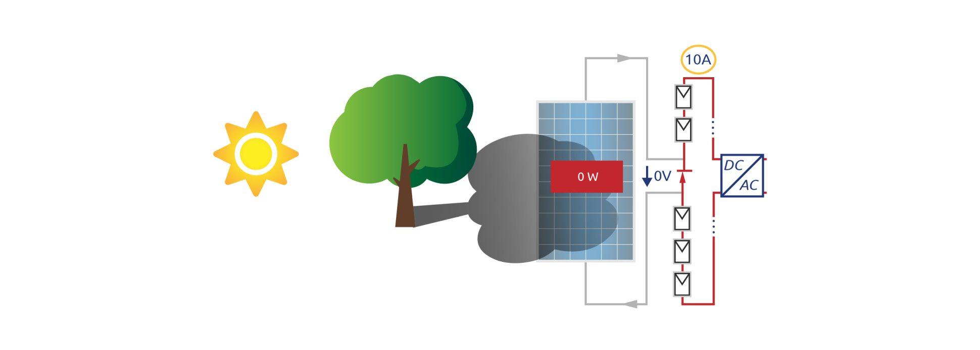 Wenn innerhalb eines Strangs bestimmte Module weniger Sonneneinstrahlung ausgesetzt sind (z.B. durch Verschattung), erzeugen diese Module geringeren Strom. Die Spannung des Moduls bleibt dabei unverändert. Durch den verringerten Strom sinkt die Leistung des Moduls (P = U x I).
