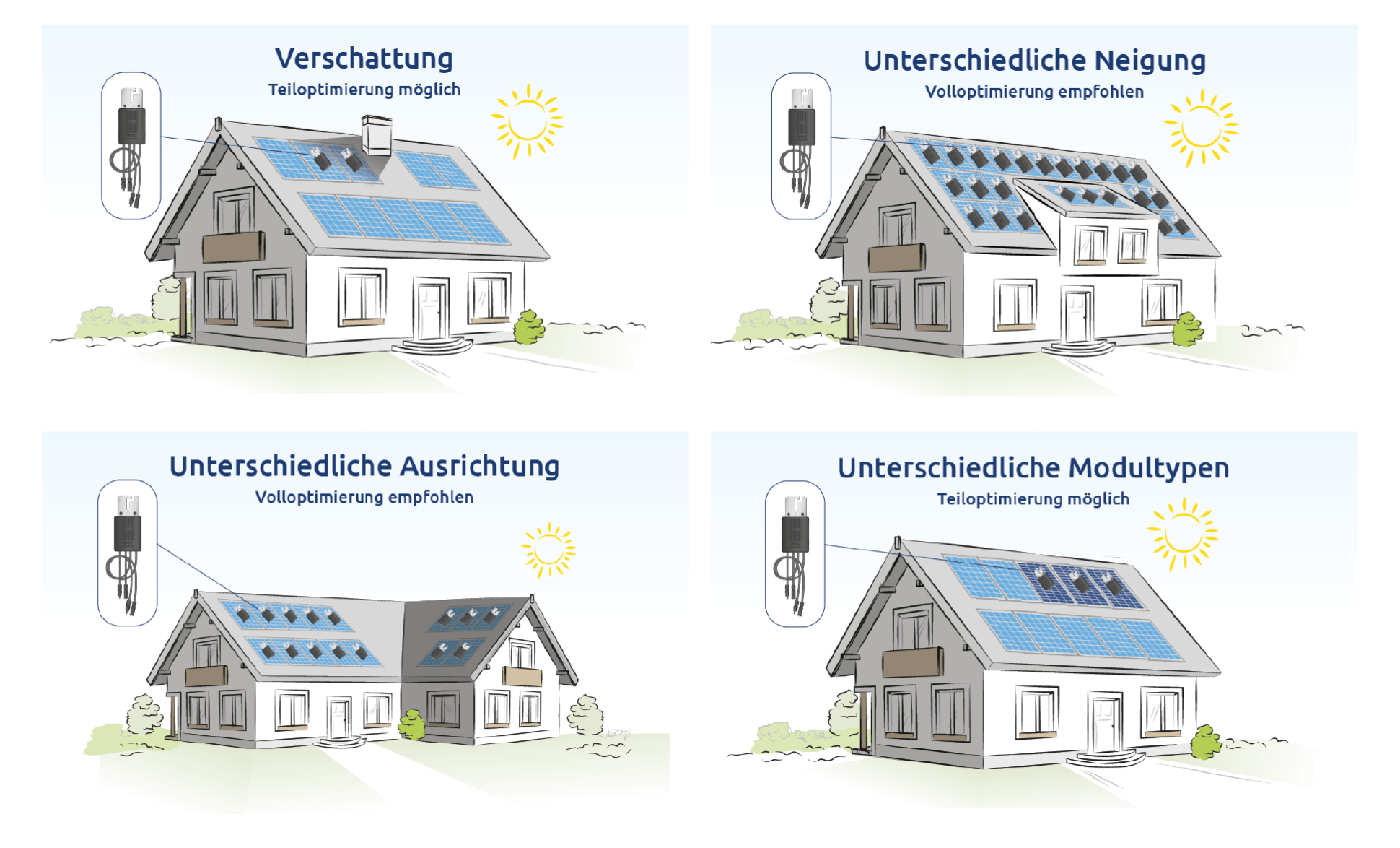 Optimierer lösen das Problem unterschiedlicher Einstrahlung im Strang. Konkret also bei Verschattungen, unterschiedlichen Modul-Ausrichtungen oder Modul-Neigung sowie bei Einsatz unterschiedlicher Modultypen.