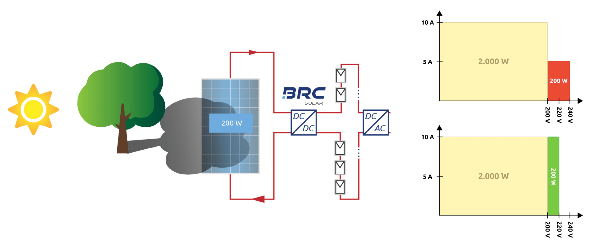 Die BRC Optimierer verhindern die Aktivierung der Bypass Dioden und somit auch die Hotspotbildung, da die Energie weiterhin ins System eingespeist werden kann. Anstatt der Bypassdiodenaktivierung durch das Globale MPPTracking, aktiviert sich nun der Optimierer und stellt sicher, dass am Ausgang des Optimierers der geforderte Strom des Wechselrichters fließt. Die restliche Energie des diffusen Lichts kann weiter genutzt werden und es entstehen keine Hot Spots.